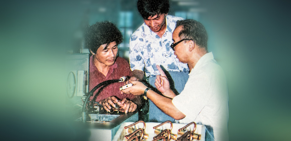 At the beginning of 1990s, Mr. Zhang Daocai led research staff working finally developed the four-way reversing valve. This product filled up the blank market in domestic impulse magnetic exchange valve, and reached the advanced level of similar products around the world. It is Sanhua’s second generation main product, which gained over a hundred million profit.
